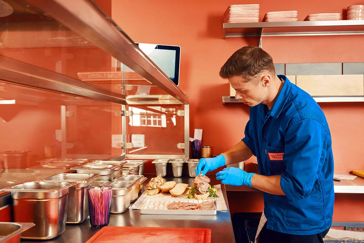 Para diferenciarse de la competencia y ofrecer la máxima frescura y calidad, los ingredientes de cada bocadillo sólo deben cortarse por encargo. Sin embargo, esto plantea al restaurante un problema de tiempo: no importa quién prepare un bocadillo en la cantina, el cliente nunca debe tener que esperar más de diez minutos. "Si hubiera un cocinero cuyo único trabajo fuera cortar carne, nuestro concepto no funcionaría", dice Martin Kammerer. "Llevaría demasiado tiempo; y tampoco sería económico, porque desperdiciaría los recursos de un trabajador cualificado".