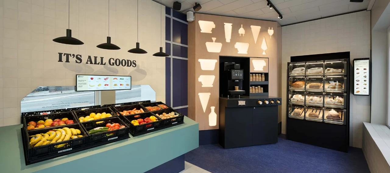 Buyers can add products to their shopping carts using order screens and make cashless payments. Then, robots assemble and deliver the order to the customer in the automated warehouse. By contrast, products such as bread, fruit and vegetables are made available for self-service in the entrance area with the help of Bizerba Smart Shelf solutions. Here, each product removed from the shelf is detected and recorded with gram and centimeter accuracy. So, the smart shelves open up to a completely new range of possibilities for efficient inventory management and, in the case of Roberta Goods, also ensure reliable monitoring in the unmanned self-service area. A precise weighing system automatically detects which product is removed from the shelf and when. The information is automatically transmitted to the back office or, if desired, even sent as a push message to the store manager's smartphone when inventory levels fall below a threshold. This continuous digital inventory monitoring not only ensures that customers always find fresh fruit, vegetables, and baked goods, but also provides information on how sales of certain products vary depending on the day of the week, time of the day, and even the weather.